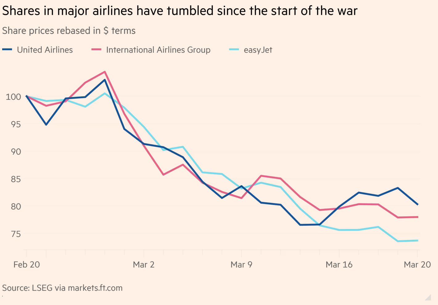 Investor unease has been clear. Since the war began, the 20 biggest listed airlines have shed roughly $53bn in combined market value, according to Financial Times estimates.